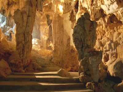 Điều độc đáo ở hang Tối và Hang Sáng là các thạch nhũ, lấy đá gõ vào thì lanh lảnh như tiếng chuông. Đó là những thạch cầm của thiên nhiên. Đặc biệt hơn nữa là những rải nhũ đá trong hang lấp lánh bảy sắc cầu vồng và mầu sắc thay đổi theo ánh sáng mặt trời.