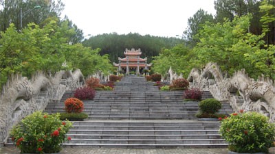 Sau ít phút dừng chân bên tượng thờ Di Lặc còn gọi là ông Địa có nụ cười viên mãn để cầu mong an lạc, hạnh phúc đầy nhà là con đường dẫn lên tháp chuông. Vượt qua 246 bậc thang, đi giữa những tán thông xanh còn đang trĩu nước của cơn mưa rào mùa hạ, tôi lắng nghe tiếng chuông trầm, âm vang, thong thả của ai đó đang thỉnh trên đỉnh núi. Và rồi tháp chuông uy nghi hiện ra. Chiếc chuông đồng cao 2,16m, nặng 1,6 tấn cũng do các nghệ nhân của phường Đúc - Huế cẩn tác. Phía trên mặt chuông có khắc lần lượt tám chữ: Thế giới - Hoà bình - Nhân loại - Hạnh phúc. Phần phía dưới mặt chuông là hình ảnh những ngôi chùa cổ kính, tiêu biểu của đất nước trải dài từ Bắc và Nam: Chùa Diên Hựu (Chùa Một Cột) ở Hà Nội, chùa Thiên Mụ ở Huế, chùa Giác Lâm ở thành phố Hồ Chí Minh và Thiền viện Trúc Lâm Yên Tử ở Quảng Ninh cùng với những hoạ tiết Rồng - Hạc, hoa lá, sóng biển được chạm khắc tinh xảo, hài hoà.