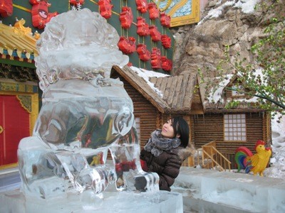 Vừa vào cổng khu này, tôi đã sững sờ trước bức tượng Phật Di Lặc cao 5 mét, ngang khoảng 3,5 mét sừng sững giữa sân. Khó mà hình dung được rằng toàn bộ bức tượng đều làm từ tuyết. Một vài góc cạnh tượng đã lởm chởm bởi bàn tay của những kẻ tò mò. Và thật tiếc khi tưởng tượng lúc mùa đông chấm dứt, cả khối tượng này sẽ tan chảy thành nước dưới cái nắng ấm áp mùa xuân….