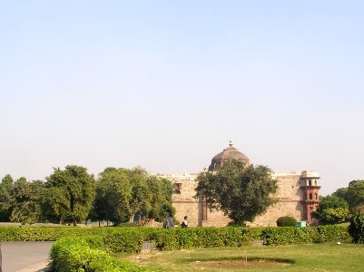 Khuôn viên mênh mông của Purana Qila nhìn từ ngoài cổng thành - xa xa là thánh đường Hồi giáo