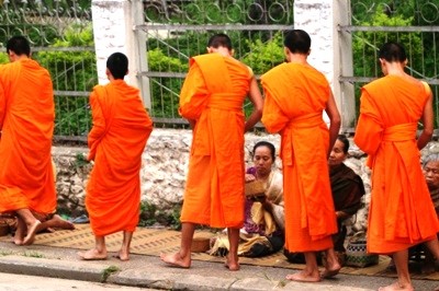 Dù đã có những nghiên cứu trước về địa danh nơi mình sẽ đến, nhưng chúng tôi vẫn ngớ người choáng ngợp vì hình ảnh thật đang ở ngay trước mắt. Một đoàn tăng lữ đang bước những bước chầm chậm trên đôi chân trần trên đường khất thực. Các tăng lữ bước sát theo nhau, người này nối theo sau người khác, người lớn tuổi hơn đi trước, nhỏ hơn đi sau. Họ bước qua những chiếu nghỉ của người dân sùng đạo trong thành phố đang chờ đợi, trên vai khoác những chiếc bình bát bằng bạc được bọc bằng đồ mây tre đan bên ngoài. Nghi thức khất thực mỗi sáng đã tồn tại bao đời nay.