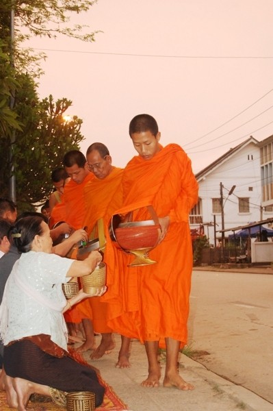 Các chõ xôi và mì tôm buổi sớm vơi dần, người ta lại mang ra những chõ xôi mới. Mỗi người một nắm xôi nhỏ. Một vài du khách nước ngoài thay vì chụp ảnh cũng đã ngồi xuống với người dân bản địa. Bố thí cho các nhà sư dường như là nghĩa vụ thiêng liêng và là niềm tự hào của người dân thành phố này.