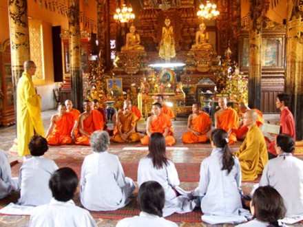 Đó là: thực tập thiền tọa, thiền hành, thiền trà; tham dự các thời pháp đàm, pháp thoại; dự lễ cầu an của Phật giáo Bắc tông Việt, Phật giáo Kh’mer; chiêm bái, đảnh lễ xá lợi huyết của Phật; nhận lộc Phật đã được chú nguyện của các vị cao tăng trụ trì. Ngoài ra còn có nhiều tiết mục khác như thả hoa đăng, xem văn nghệ, xin chữ, học cách cắm hoa, chưng quả…