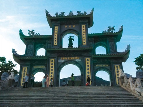 Tôi đến Linh Ứng tự ở bãi Bụt, Sơn Trà khi chiều muộn vì nghe nói nơi đây sẽ đẹp và lạ hơn vào buổi tối. Vừa leo hết dãy bậc thang để lên khoảng sân trước chùa, ngay lập tức một khung cảnh trời nước mênh mang hiện ra trước mắt tôi. Có thể nói, xét về mặt tầm nhìn và phong thủy, Linh Ứng tự có vị trí độc nhất vô nhị ở khu vực Đà Nẵng. Chùa nằm trên một ngọn đồi, lưng dựa vào rừng nguyên sinh bạt ngàn, mặt hướng ra biển lớn. Đứng trước sân chùa, nhìn về tay phải là đèo Hải Vân mờ mờ trong mây, là dòng sông Hàn thơ mộng uốn lượn, là thành phố Đà Nẵng nhà cửa nhấp nhô. Nhìn về tay trái là sóng nước mênh mông, xa xa cù lao Chàm như một tấm bình phong án ngữ…