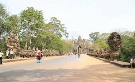 Có thể nói, công trình gây chú ý đầu tiên cho du khách khi đến tham quan Angkor Thom chính là sự bề thế của cổng thành, với dọc hai bên đường vào là đôi hàng tượng đá to lớn ôm thân rắn thần Naga 7 đầu, một bên là các ông Thiện, một bên là các ông Ác, trong tư thế kéo co, dài khoảng vài trăm thước.