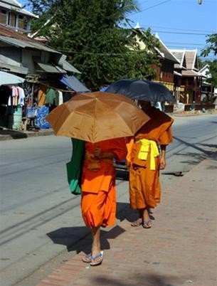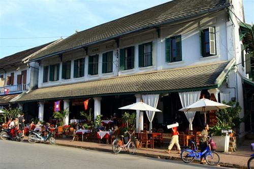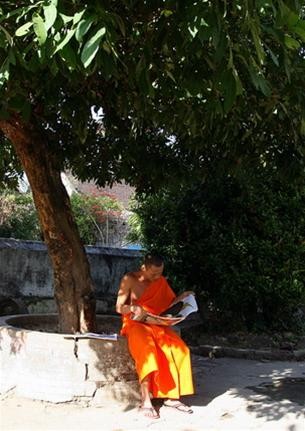 Lang thang trên phố, chúng tôi thường thích sà vào những quán ăn ven đường. Và có một buổi chiều như thế với món phở kiểu Lào thật cay, ngay bên dòng Nậm Khan. Bữa ăn khá ngon và rẻ, vừa ăn vừa ngắm bọn trẻ hai bên bờ sông chọc ghẹo lẫn nhau. Một bên là trẻ trên phố vừa đi học về, một bên bọn trẻ nông thôn đang trần truồng bêu nắng trên những vạt cát ven sông cạnh những thửa ruộng xanh ngát. Ai nhìn thấy cảnh tượng huyên náo trên cũng bất giác mỉm cười. Cuộc sống trôi đi như thật chậm ở những nơi này...Ngày cứ trôi qua thật chậm rãi và bình yên như thế này ở Luang Prabang