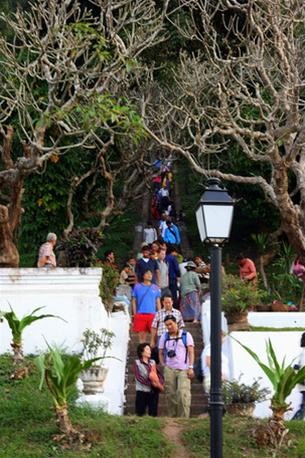 Đến Luang Prabang không thể quên được các quần thể chùa chiền, là trung tâm Phật giáo của Lào, Luang Prabang có đến 35 đền chùa khác nhau, nơi nào cũng đáng tham quan. Ấn tượng mạnh nhất với tôi có lẽ là chùa vàng Wat Xieng Thong. Quần thể những ngôi chùa ở đây hài hòa và mang nét kiến trúc đặc trưng Lào. Cũng như ở khắp nơi trên đất nước triệu voi, các nhà sư rất được trọng vọng tôn kính. Dâng thức ăn cho các nhà sư vào mỗi buổi sáng được coi là là niềm hạnh phúc và sự ban tước phước lộc đối với mỗi người. Mỗi sáng cảnh tượng quanh các chùa chiền ở Luang Prabang sống động hẳn khi hàng đoàn người quỳ xuống dâng thức ăn cho các vị sư. Đặc biệt ở Luang Prabang dễ bắt gặp mọi lúc mọi nơi những bóng áo cà sa của sư sãi. Trên đường, trong chùa hay lênh đênh trên những cây cầu tre nối qua sông Nậm Khan, chỗ nào cũng thấy hình dáng họ tô điểm thêm một nét rất riêng cho thành phố. Trèo 300 bậc lên với đỉnh Phou Si là "nghi lễ“ không thể thiếu được khi đến Luang Prabang của bất kỳ du khách nào. Đỉnh núi thiêng nằm ngay trong trung tâm thành phố, đối diện với hoàng cung. Từ trên cao nhìn xuống thành phố như một nàng tiên trong giấc mộng, tha hồ thả cho hồn cho bay bổng. Và khi hoàng hôn xuống, đỉnh Phou Si sẽ nằm trọn trong tay khách du lịch, mỗi khoảnh khắc thời gian lại mang đến cho cảnh vật những nét mơ màng khác nhau. Trên đường xuống núi khách thường ghé khu vườn tượng Phật, nơi có đủ Phật thứ hai cho đến Phật chủ nhật và vết chân Phật khổng lồ. Chúng tôi rẽ vào hoàng cung, Bảo tàng Quốc gia... Những không gian yên tĩnh và thoáng mát với hồ nước nở đầy hoa súng, với những hàng dừa và cọ xen lẫn nhiều loại cây che mát... Đẹp và hoành tráng hơn trong khuôn viên hoàng cung là ngôi chùa Sala Pha Bang, nơi tượng Phật Pha Bang, món quà của vua Khơmer dành cho vua Fa Ngum khi ông lên ngôi, được lưu giữ và trưng bày. Lòng vòng suốt mấy ngày với một loạt đền chùa những ngày ở Luang Prabang nhưng vẫn không có cảm giác nhàm chán. Nơi nào cũng để lại những dấu ấn bình yên và rất riêng...Ấn tượng của Luang Prabang là những tháp chùa cao vút mảnh mai vẽ lên trờiDu khách vui sướng leo lên đỉnh Phou Si ngắm hoàng hônCó đủ Phật cho từng ngày trong tuần
