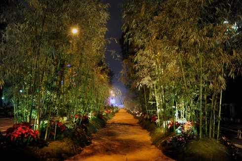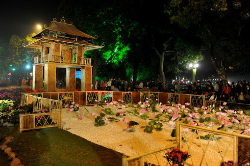 Tượng đài Lý Thái Tổ sáng bừng trong đêm hội hoa.