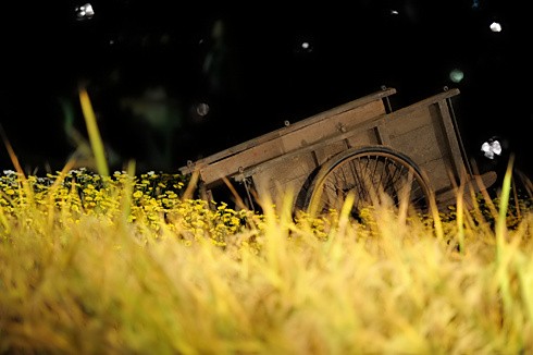 Hình ảnh làng quê Việt Nam với những rặng tre xanh lung linh trong đêm, hàng lau, đàn cò trắng trên ruộng lúa, chiếc xe cải tiến và chiếc cầu tre bắc qua hồ .