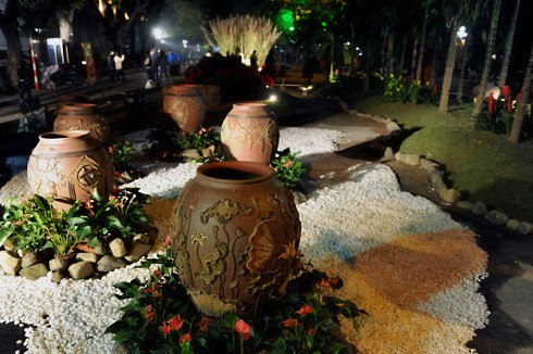 Hoa xung quanh những chiếc chum gốm.