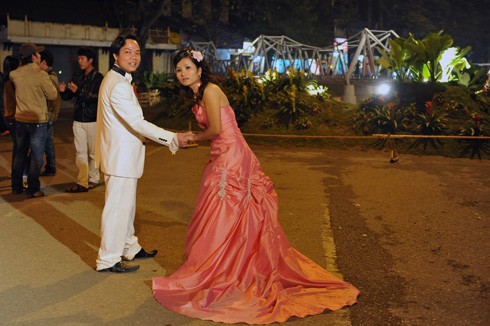 Cô dâu chú rể tranh thủ chụp ảnh