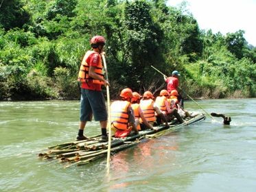 Tuy chưa hết mệt vì hang Tử Thần nhưng tôi vẫn quyết định thử một dịch vụ khá độc đáo của Madagui: “Chèo bè vượt suối”. Nai nịt áo phao gọn gàng, điện thoại di động được bọc nilon cẩn thận, trang bị thêm một cây sào tre, tôi lên bè vượt suối. Khởi hành từ ngã ba sông Tuyết Nhung cùng với một người hướng dẫn của Madagui, bè chúng tôi lúc trôi lờ lững trên dòng suối trong vắt, lúc lại băng lướt ào ào qua ghềnh đá. Về đến đích là bãi Tình Yêu, bước lên bờ mà bên tai tôi vẫn còn văng vẳng tiếng suối reo…