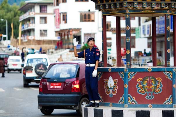 Cảnh sát giao thông ở thủ đô Thimphu và bục chỉ đường với các họa tiết trang trí thuộc “tám tướng cát tường”của Phật giáo Mật tông